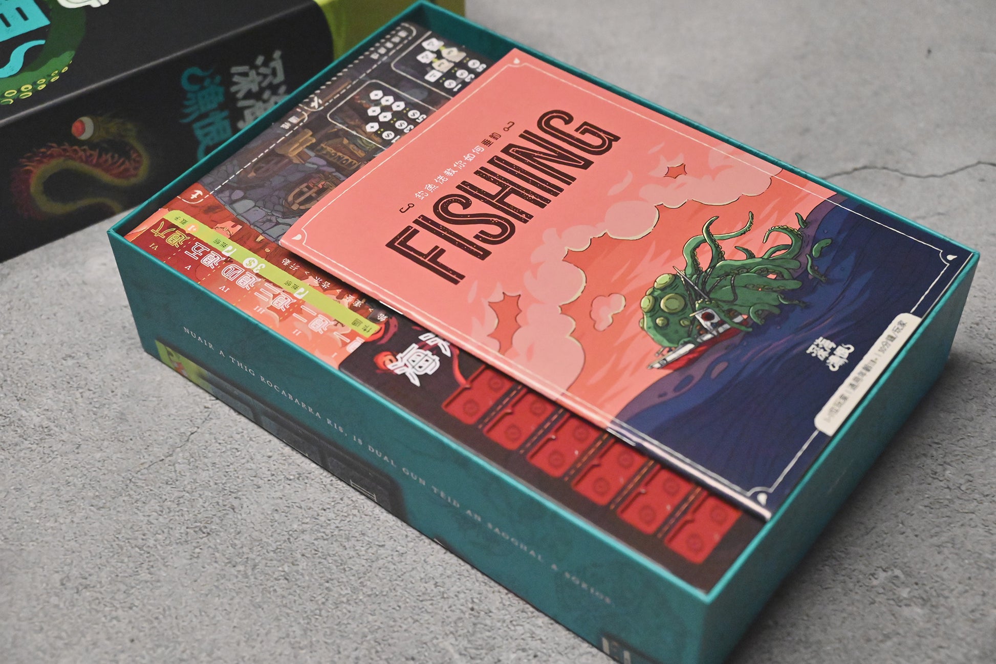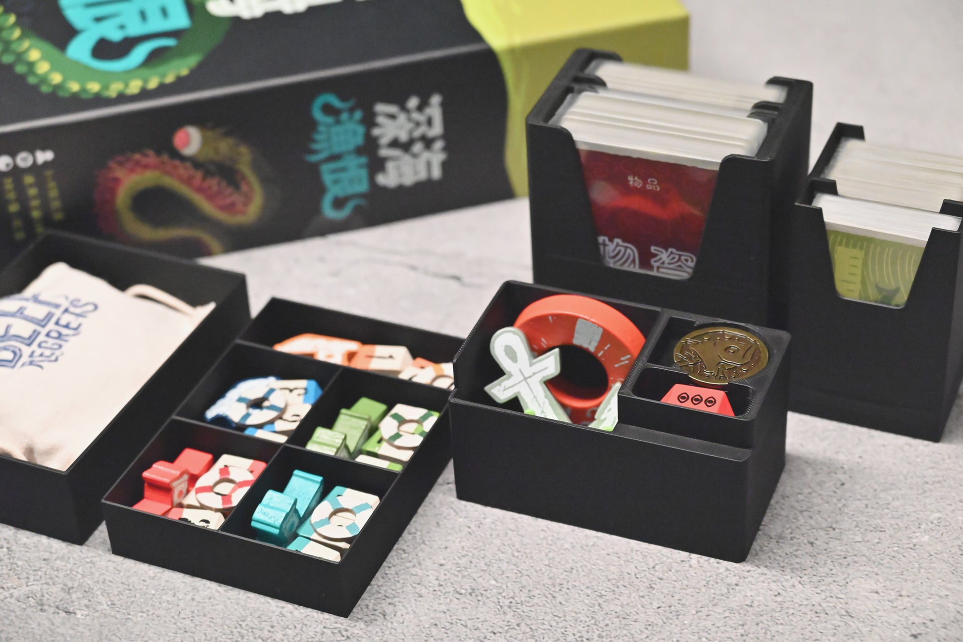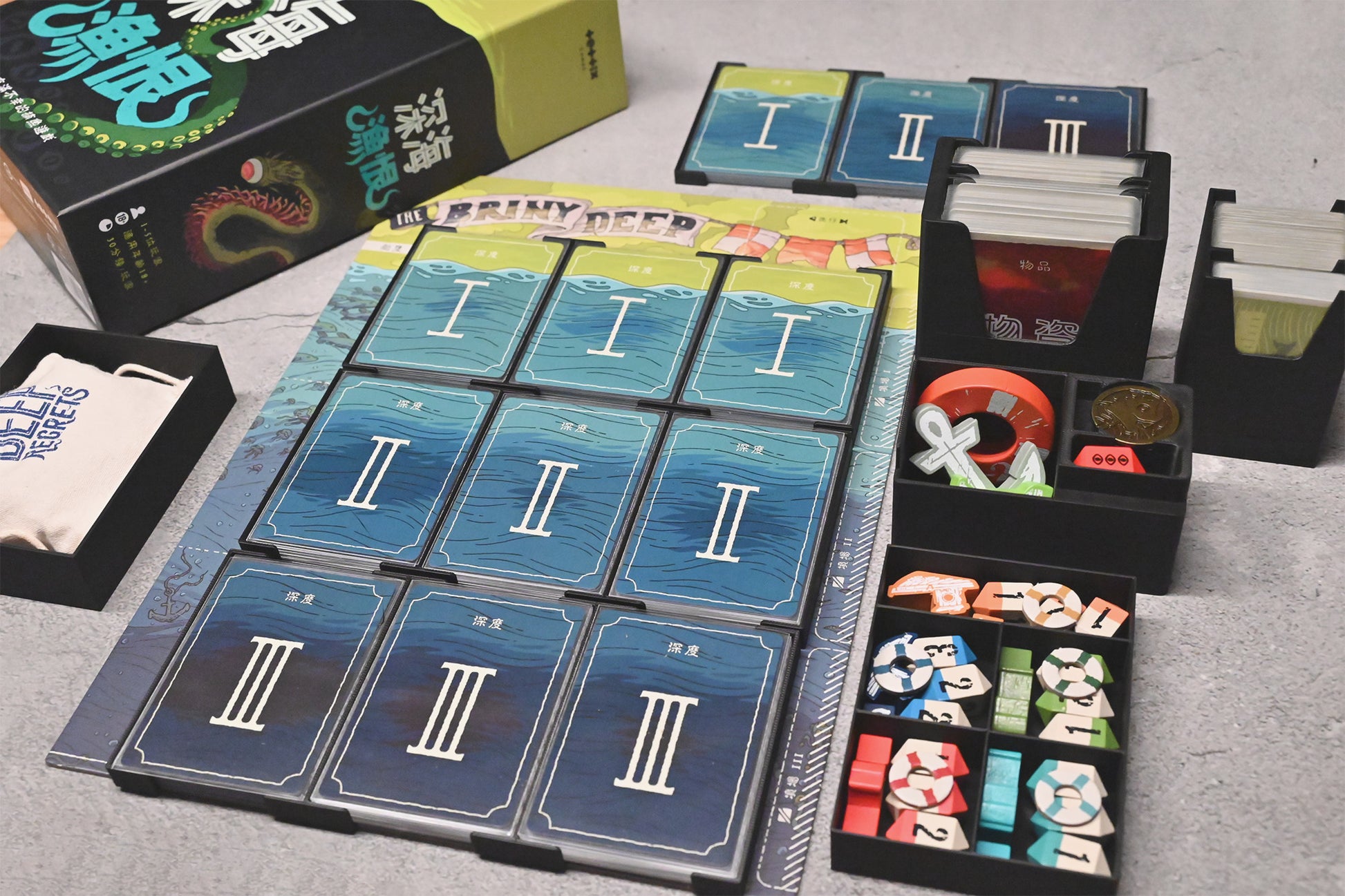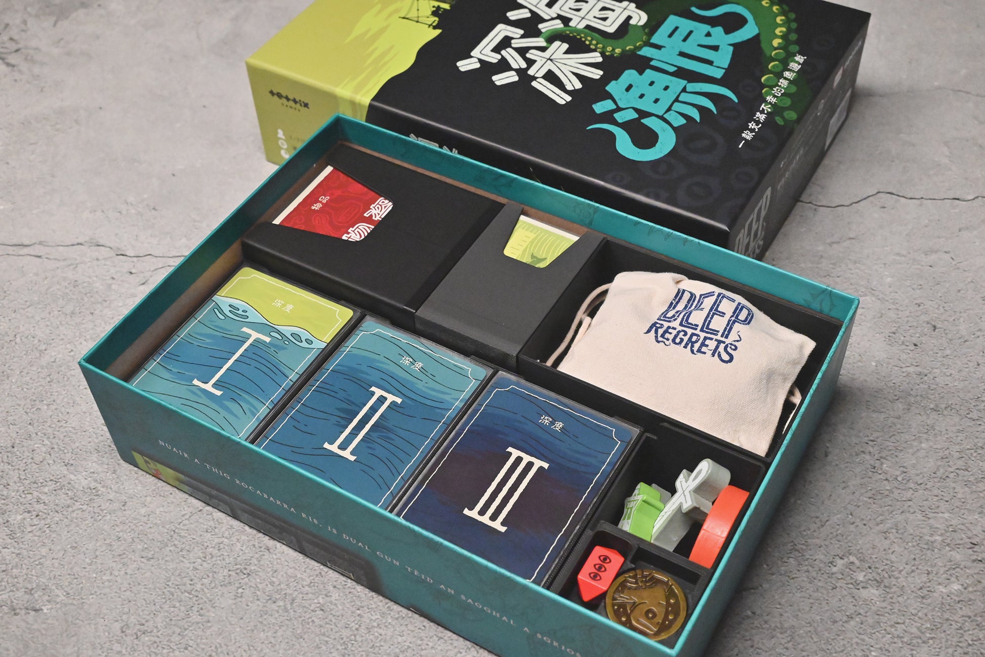《深海漁恨 Deep Regrets》收納盒包含多個牌架,可快速設置深度1~3的漁貨卡。其餘的物資卡、悔恨卡、玩家配件、各類標記物皆分類擺放、整齊收納。空間支援牌套(備註),並且支援豎放遊戲盒。《悲慘觸手》迷你擴充的所有配件可一併收入。